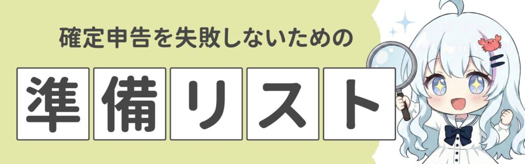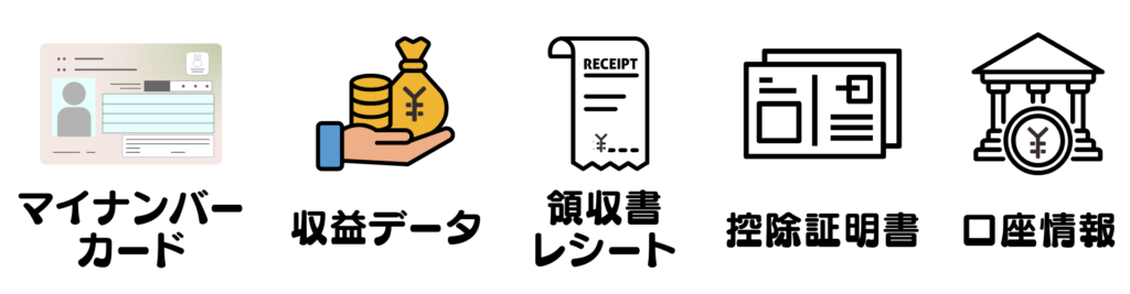 マイナンバーカード、収益データ、領収書、控除証明書、銀行口座。
