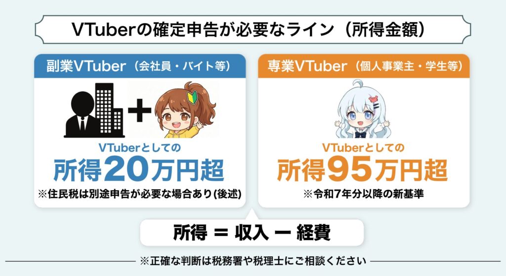 判定基準:VTuber活動の「所得(=収入ー経費)」が年間95万円を超えたら申告が必要