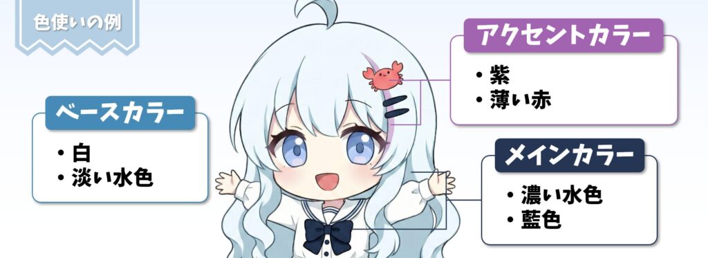 - アクセントカラー:強調したい部分(瞳の色や装飾品などの目立つ色)