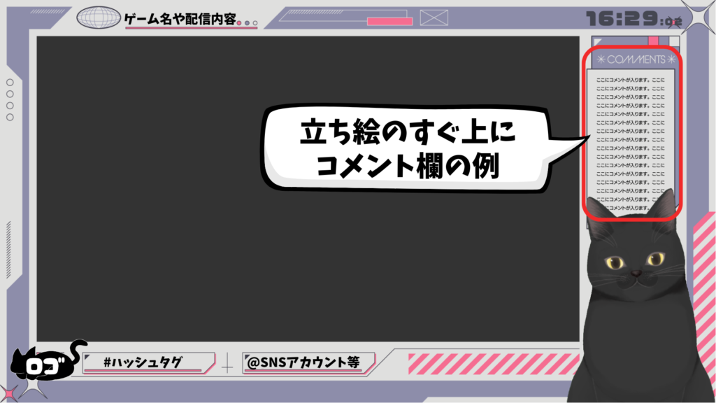 この視線の移動距離を減らすのがコツです。 一般的にゲーム配信では、「立ち絵のすぐ上(または横)にコメント欄を配置する」のが王道です。